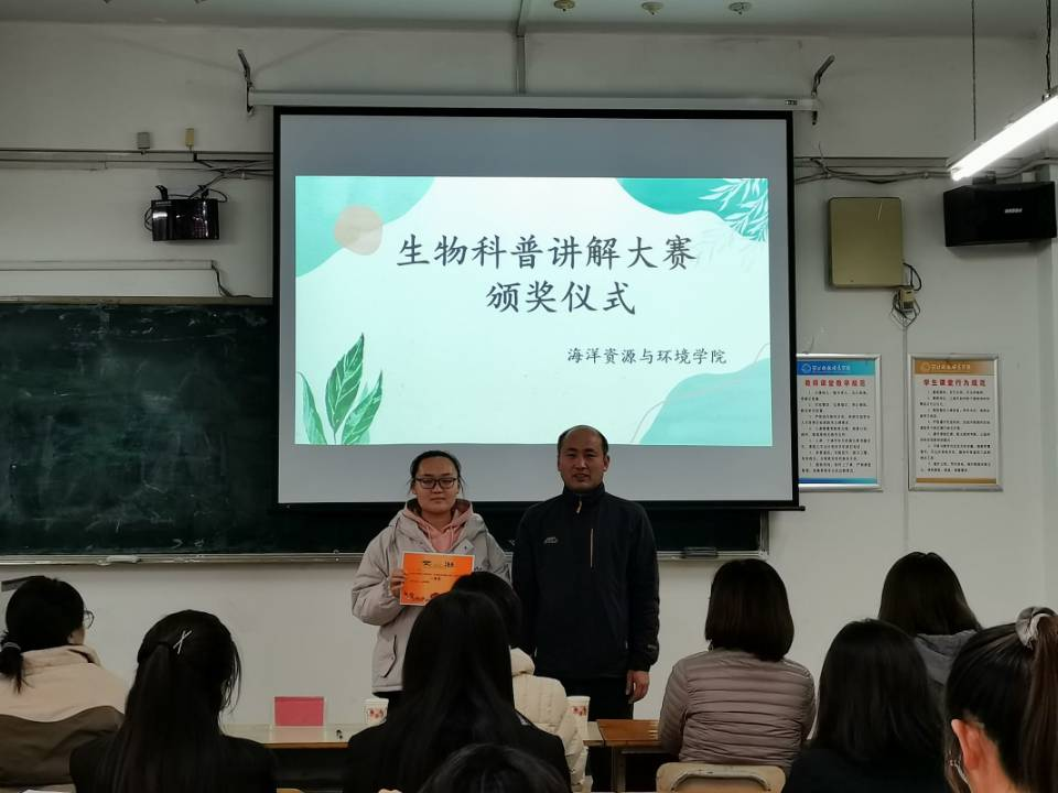 比赛邀请了生物标本馆馆长张波老师,海洋生物资源教学部龙茹老师,团委书记王明洁老师,学工办主任李国伟老师,学科和科研办公室主任华昕彤老师,学工办副主任鲍家卉老师等担任评委.参赛选手是来自生技、生科、海资等专业的9位同学。本次比赛主要分为三个环节.首先由各位参赛选手依次上台展示科普PPT,并对PPT内容进行讲解;然后由各位评委老师打分;最后主持人公布比赛结果,由张波馆长与龙茹老师对参赛选手和大赛进行了点评,并为获奖员工颁奖。