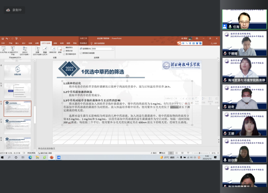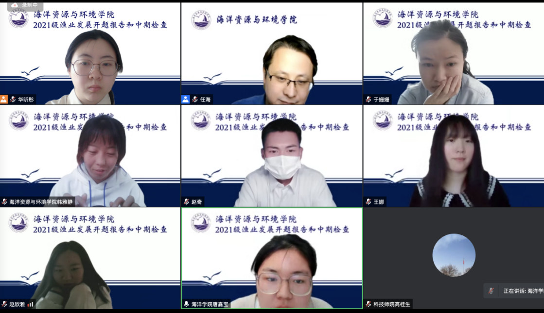 2022年5月18日上午,公司召开2021级渔业发展专业学位研究生中期检查暨开题报告会。该届渔业发展专业研究生是公司自成立以来首批招收的硕士研究生,学院对研究生的论文开题工作非常重视,成立由任海副教授作为组长,高桂生、靳晓敏和于姗姗作为组员的考核小组,21级全体硕士研究生通过线上方式参与此次开题答辩。