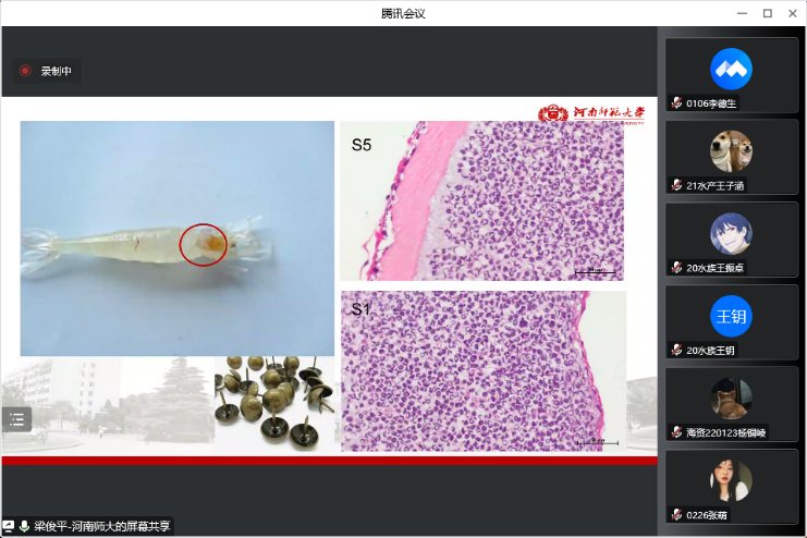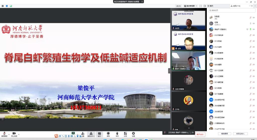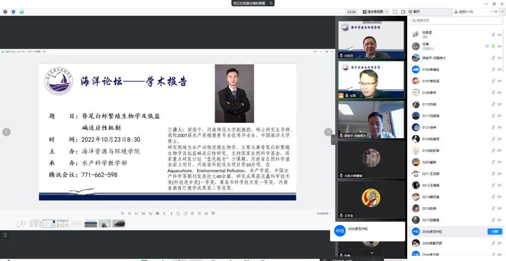 2022年10月23日上午,suncitygroup太阳集团三期海洋论坛活动在腾讯会议线上进行,本次活动邀请了优秀员工河南师范大学梁俊平博士给公司师生做学术报告。会议由水产科学教学部任海博士主持,水产科学教学部全体教师、渔业发展硕士研究生以及suncitygroup太阳集团本科生300余人收听了报告,公司党委副书记、副经理孙胜显出席会议。