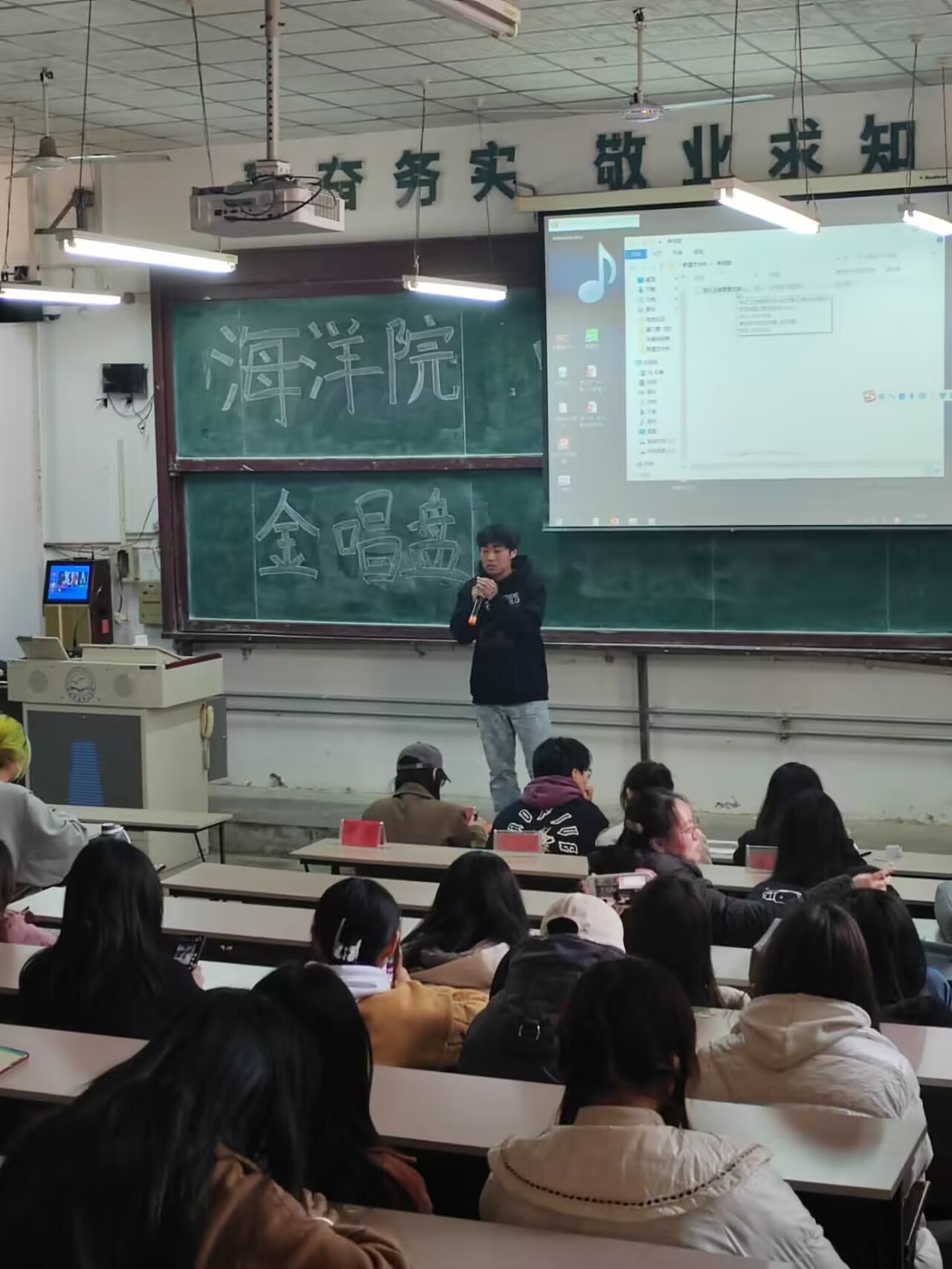 比赛开始,主持人介绍评委及嘉宾阵容。随后选手们便展开了激烈的角逐,台下的观众们刚随着一号选手赖滢冰的《南下》到达了远离世俗嘈杂的世外桃源,便被二号选手刘雅琦的《大鱼》所感染,感受着她歌词中无可奈何的悲楚与落寞,三号选手孙晋海的一句句粤语,台下的观众们又被带入了新的世界......伴随着台上选手激情澎湃的歌唱,台下观众热情洋溢的掌声,比赛迎来了尾声。此时的现场已热血沸腾,比赛的输赢已然不重要,重要的是一位位选手为大家带来的精彩绝伦的演出。最终孙晋海同学获得冠军,推荐参加校级决赛。
