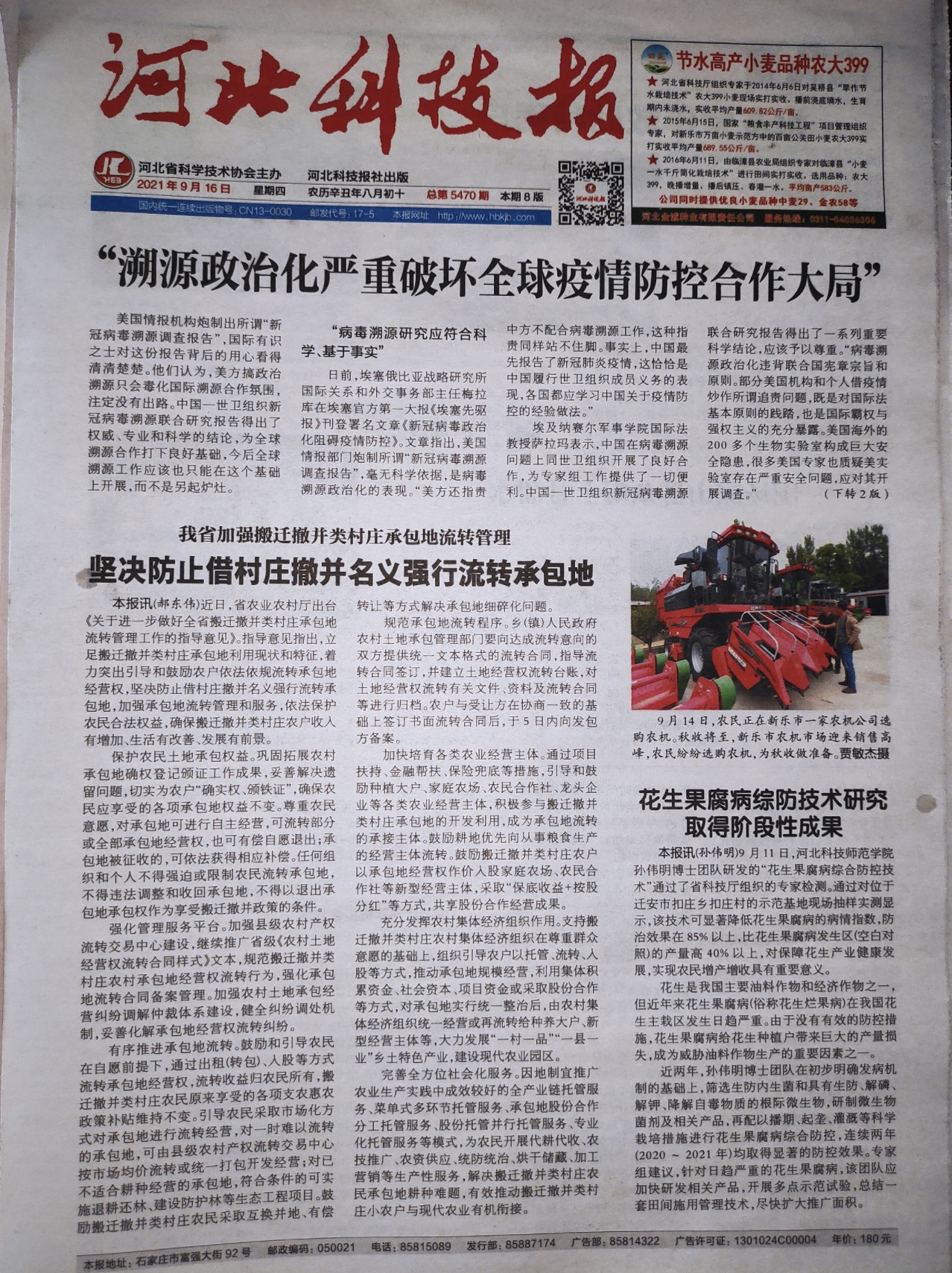 2021年9月16日,《河北科技报》以《花生果腐病综合防控技术取得阶段性成果》为题,报道了公司孙伟明教授在花生果腐病综合防控技术取得阶段性成果,全文如下: