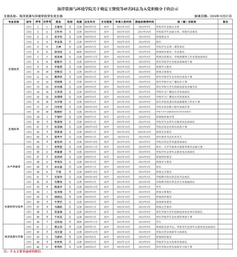 根据发展党员工作有关规定,在团组织推优及征求党员意见的基础上,经支部委员会2024年10月21日会议研究决定,将王馨悦等45名同志确定为入党积极分子,现将其有关情况公示如下: